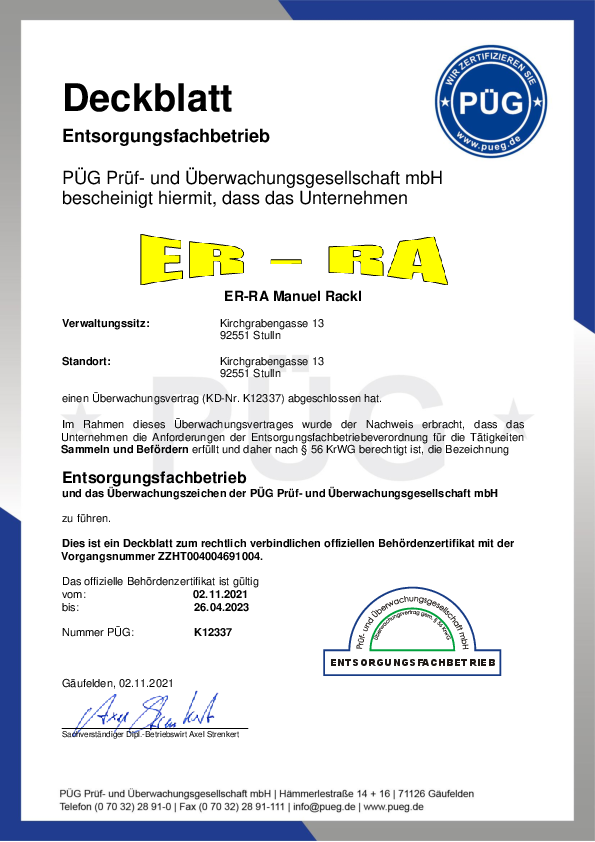 Schicken Sie bitte keine Abmahnung ohne vorherigen Kontakt Wenn der Inhalt oder die Aufmachung dieser Seiten fremde Rechte, die Rechte Dritter oder gesetzliche Bestimmungen verletzen, so bittet ER-RA Manuel Rackl Entsorgung Transporte um eine entsprechende Nachricht ohne Kostennote. Die Firma ER-RA Manuel Rackl Entsorgung Transporte garantiert, dass die zu Recht beanstandeten Passagen unverzüglich entfernt werden, ohne dass von Ihrer Seite die Einschaltung eines Rechtsbeistandes erforderlich ist.
